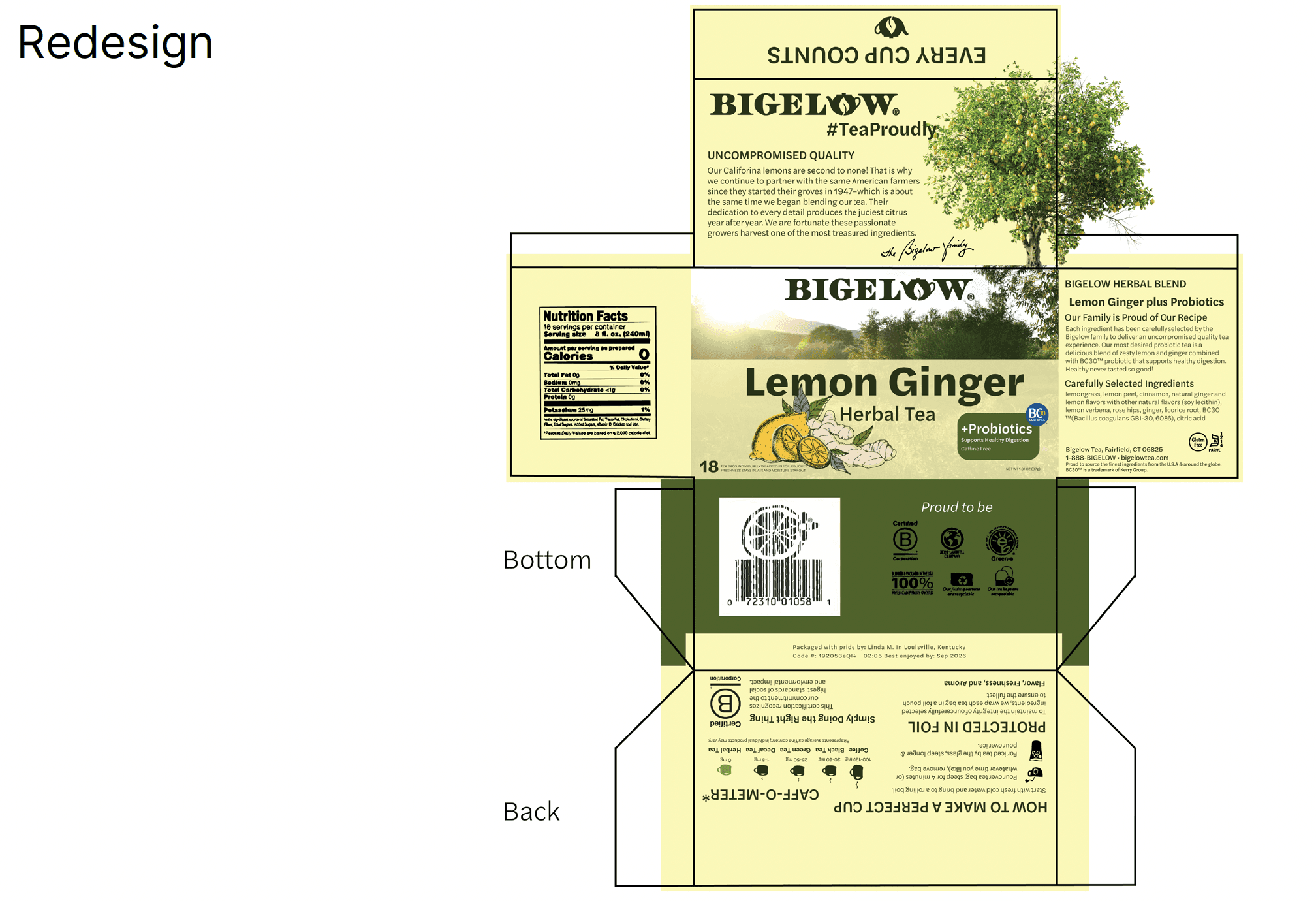 This packaging redesign was done "sprint style", meaning I only worked on it for 3 hours. The new packaging highlights the lemon tree farm, along with the probiotics in the tea. Using the same dielines as the original box, giving the design a refresh was a fun way to challenge myself.